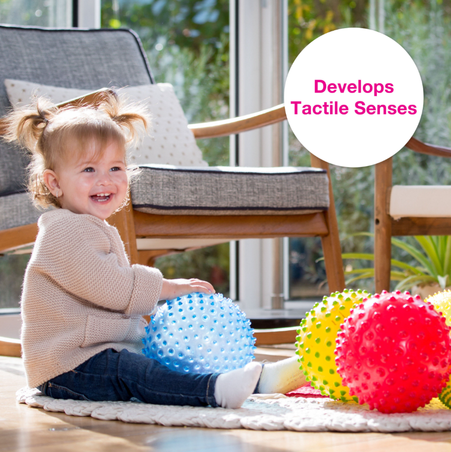 Varied textures and colors enable tactile sensory development no matter the age, varied sizes enable development of fine motor skills, and their bounciness entices babies to run around and play leading to gross motor skill enhancement.