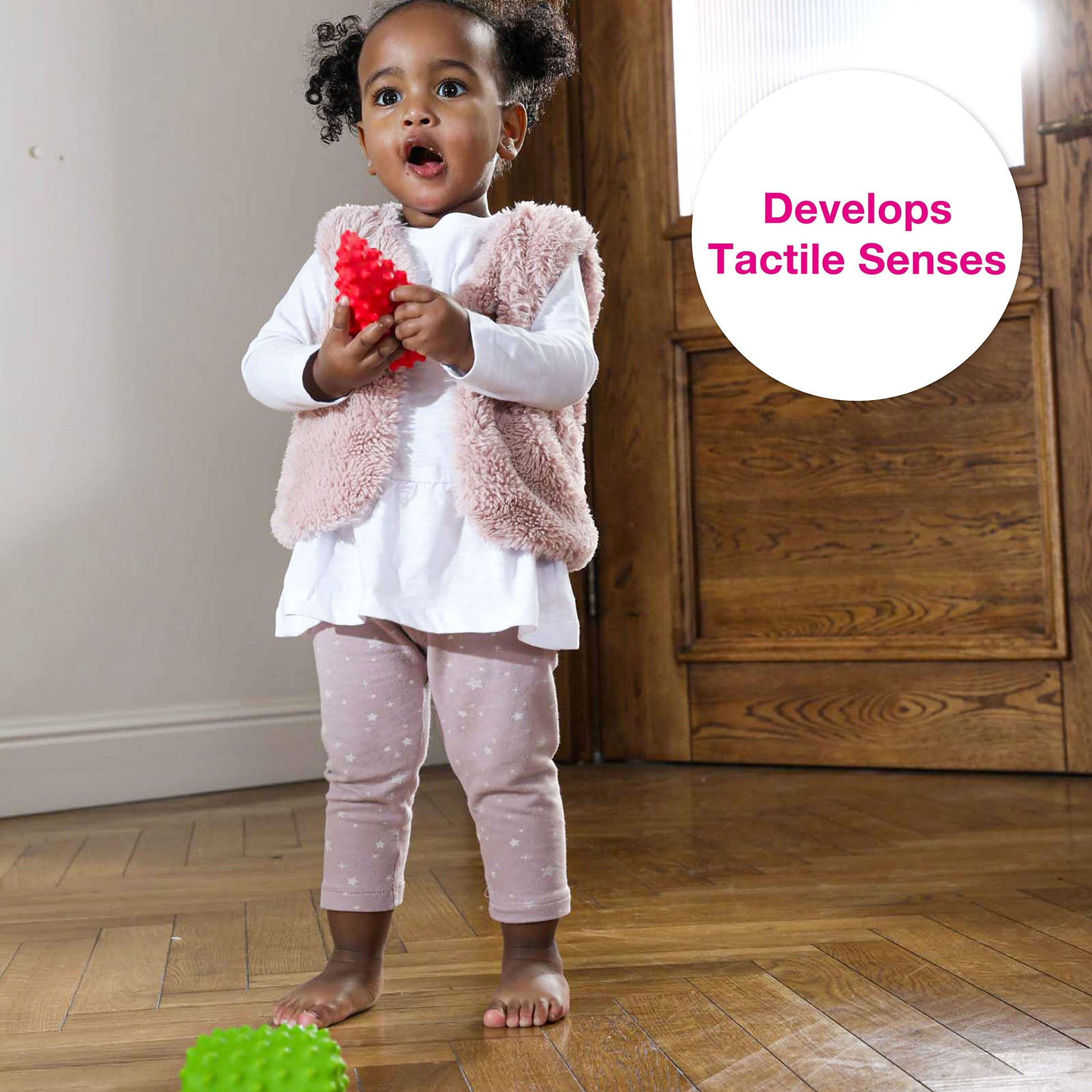 Varied textures and colors enable tactile sensory development no matter the age, varied sizes enable development of fine motor skills, and their bounciness entices babies to run around and play leading to gross motor skill enhancement.