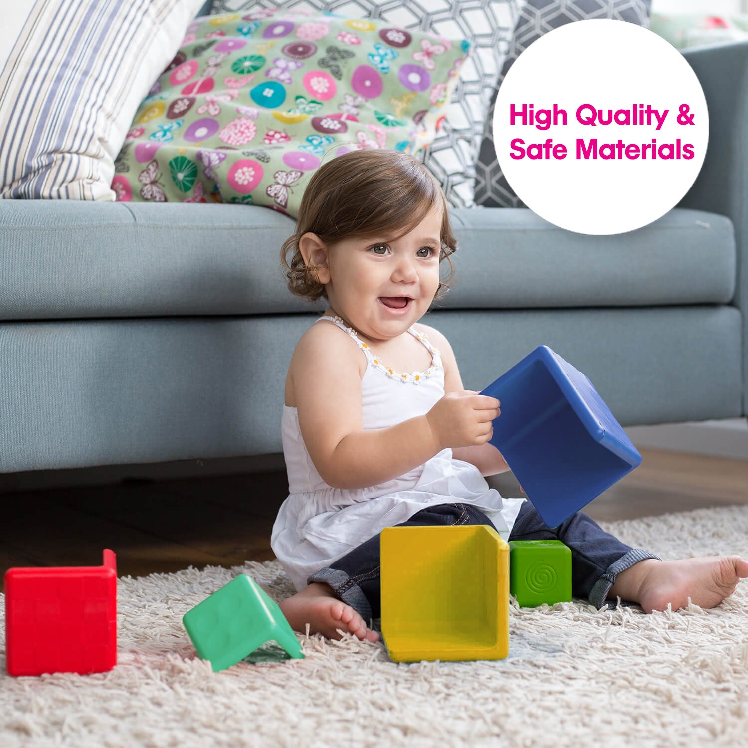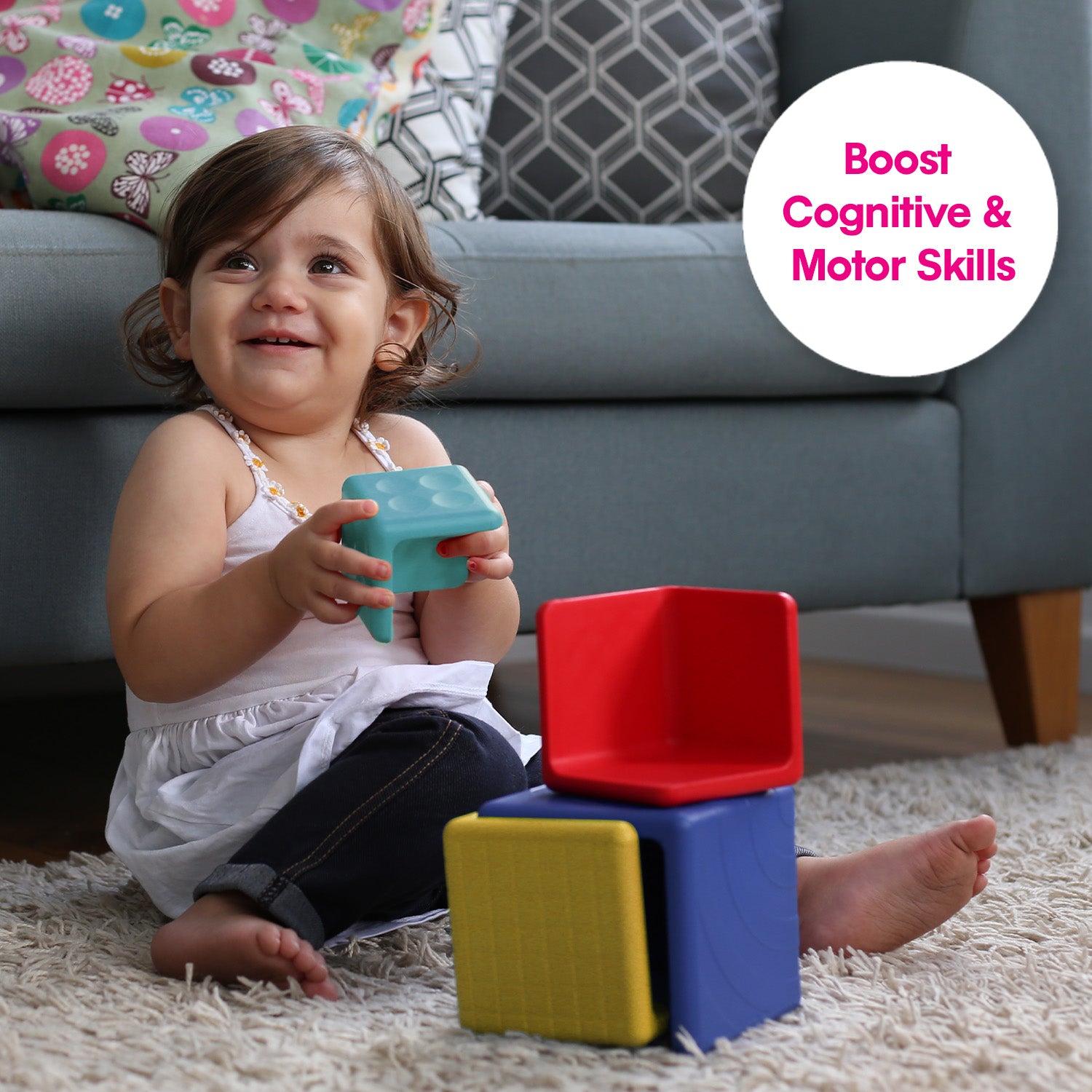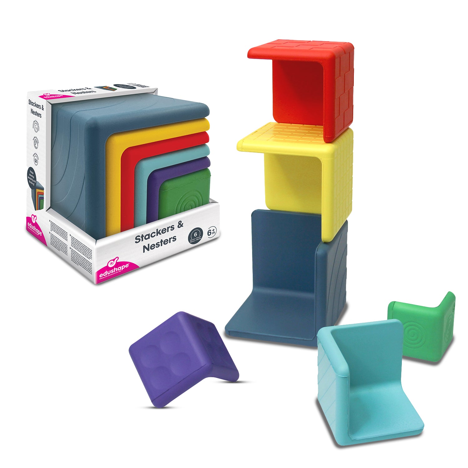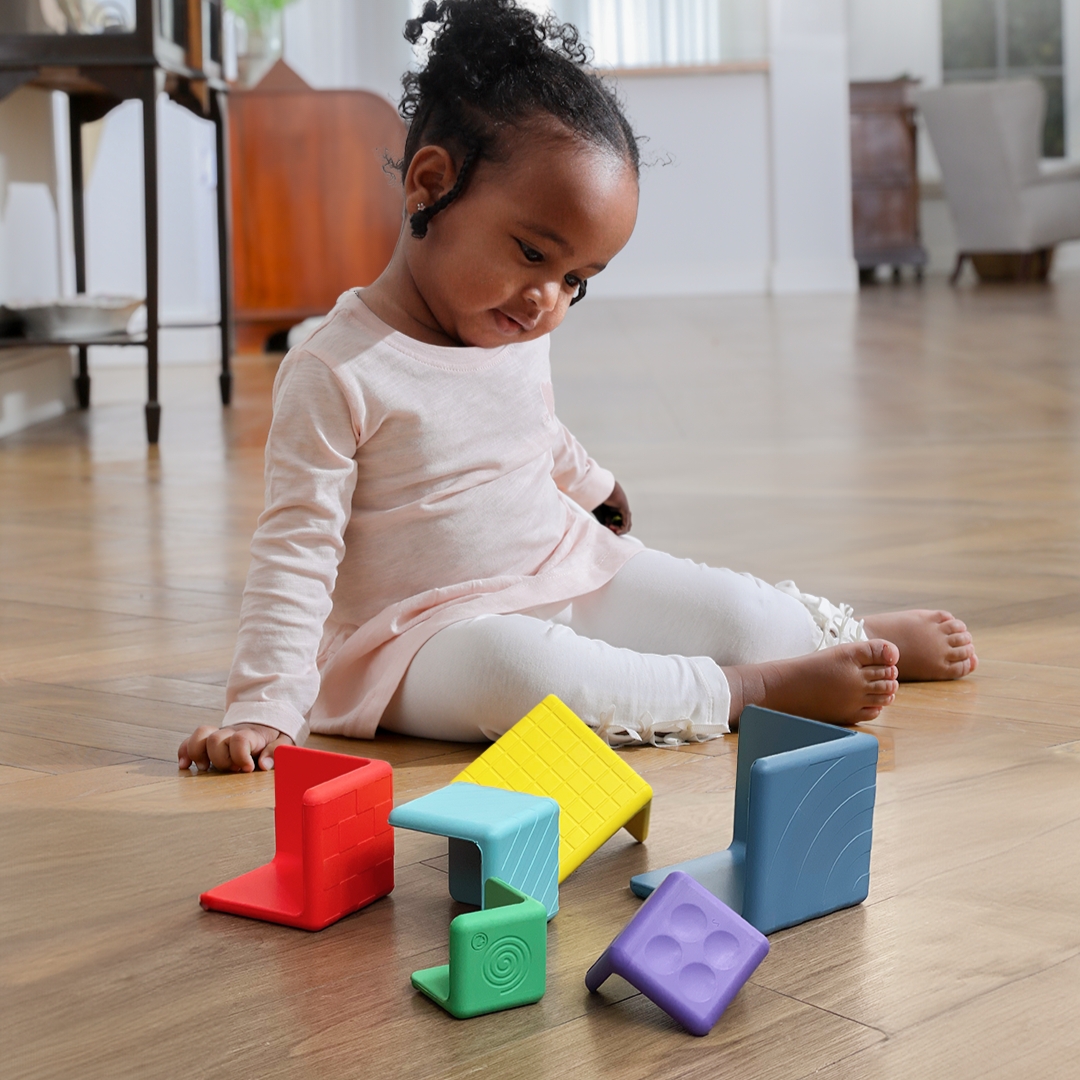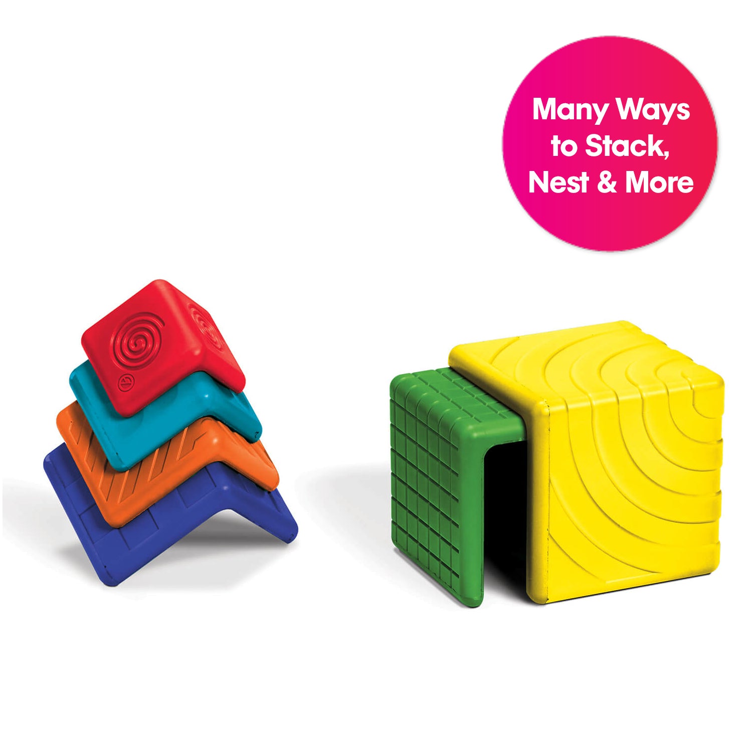 Rotated one way, pieces nestle into each other; rotated the other way, they stack into a cubic shape. Little ones will love these colorful textured shapes. Great for open-ended play, sensory development, cognitive, and motor skills!